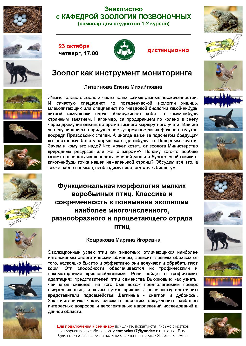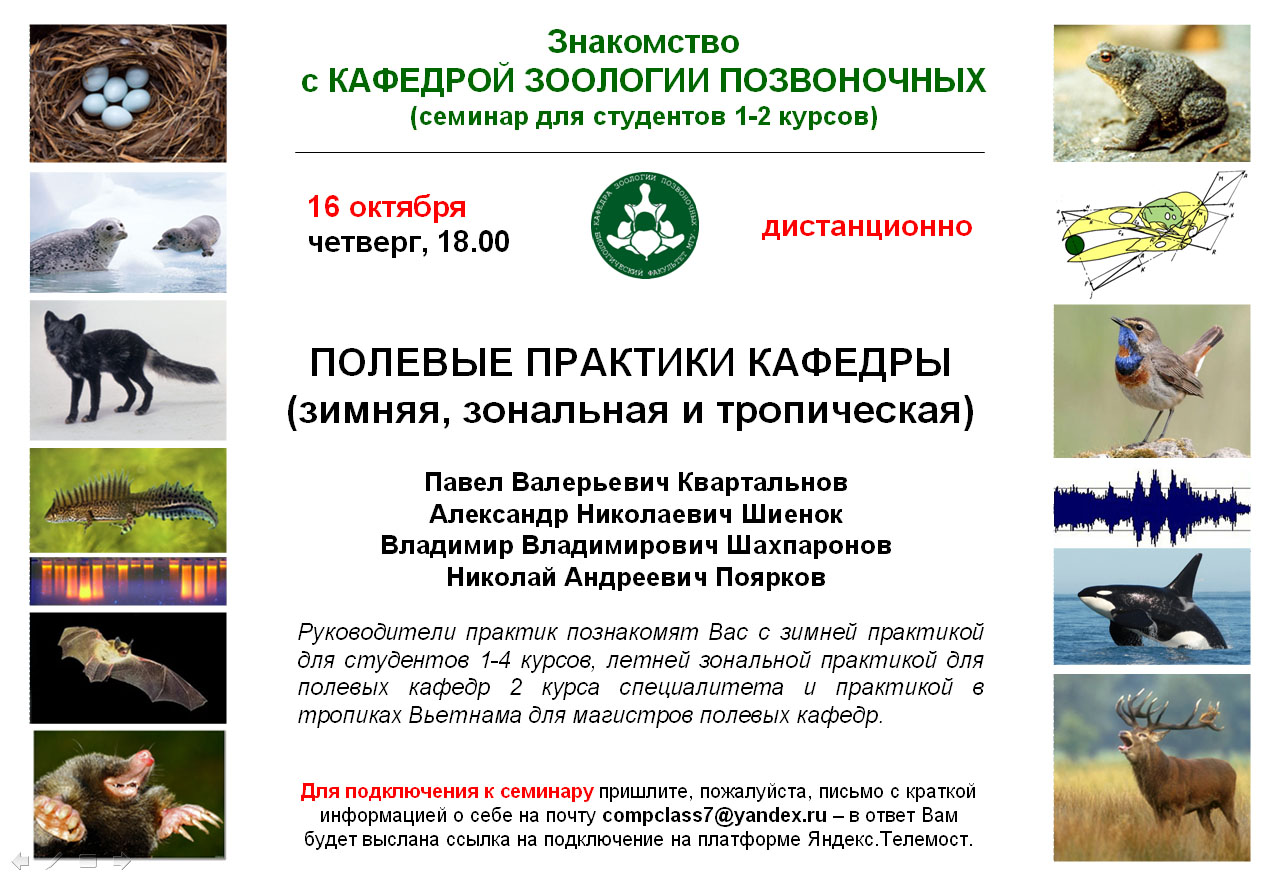 В начале весеннего семестра второго курса студенты Биологического факультета должны распределиться по кафедрам. Чтобы помочь студентам более осмысленно сделать выбор, в осеннем семестре, начиная с октября, мы проводим семинар «Знакомство с Кафедрой Зоологии Позвоночных». На него приглашаются студенты 1-2 курсов. Семинар проводится в вечернее время, для желающих, и согласуется с расписанием занятий 2 курса.