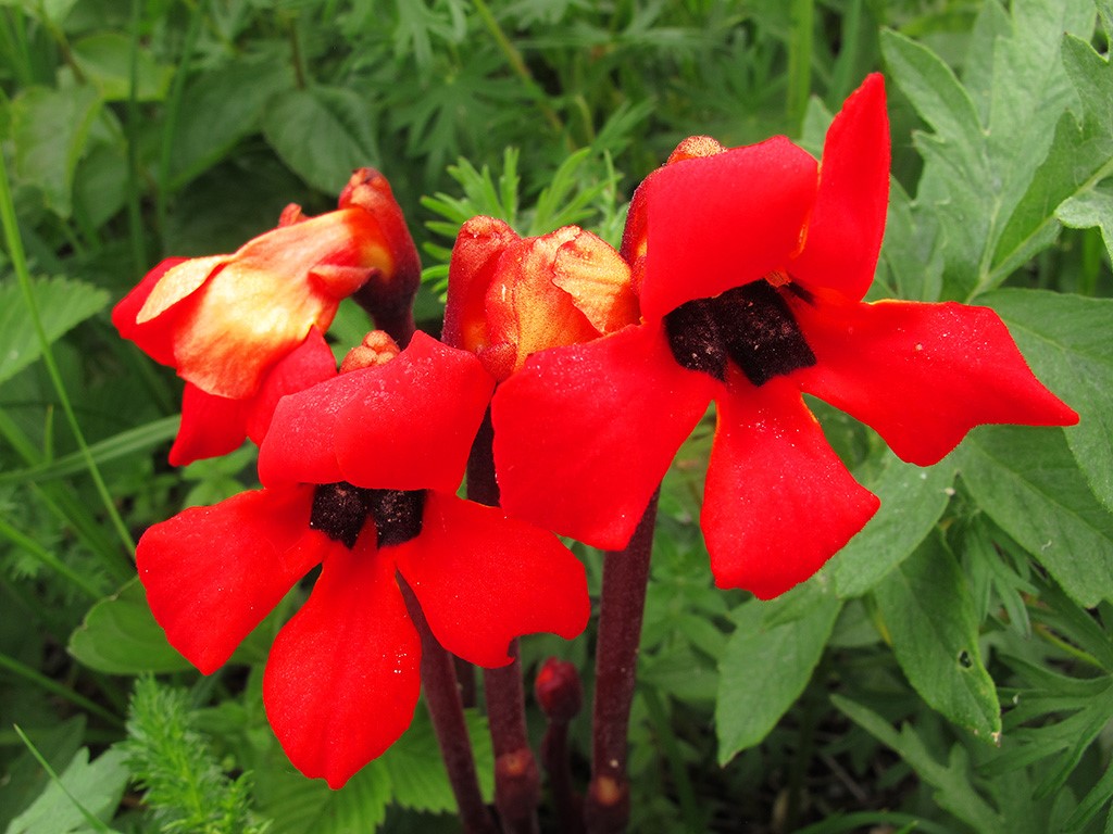 Это я написала через много лет и совсем в других местах, но в Теберде мы видели примерно то же самое!  Особенно крупный ярко-красный цветок, Дифелипею красную, наш однокурсник Леня Парастаев, уроженец Кавказа, упрямо называл «кровь семи братьев», игнорируя его научное название. Ночевали мы на кордоне заповедника выше лесного пояса, а утром спустились в лагерь.