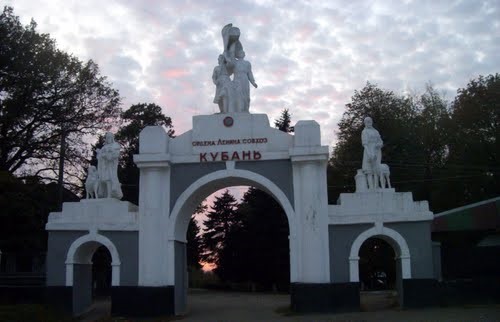 Наверное, не найдется ни одного человека, жившего в Советском Союзе, кто не видел бы фильм «Кубанские казаки» Ивана Пырьева (1949 г). Культовые песни – «Каким ты был, таким ты и остался…» да «Ой, цветет калина в поле у ручья…» – любимые, застольные, впервые прозвучали в этом фильме. А фильм был снят на землях совхоза Кубань. В.Е. Соколов бывал там раньше, и у него явно были связи с местным руководством. Мы это сразу ощутили по теплому приему. А место и впрямь было удивительное, впечатляло ухоженностью и благоустройством в самом лучшем смысле слова. Рассказали нам и об истории этого процветающего хозяйства.