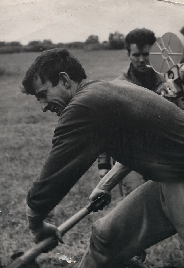 В. Садовников копает почвенный разрез, а оператор Соловьев наблюдает.