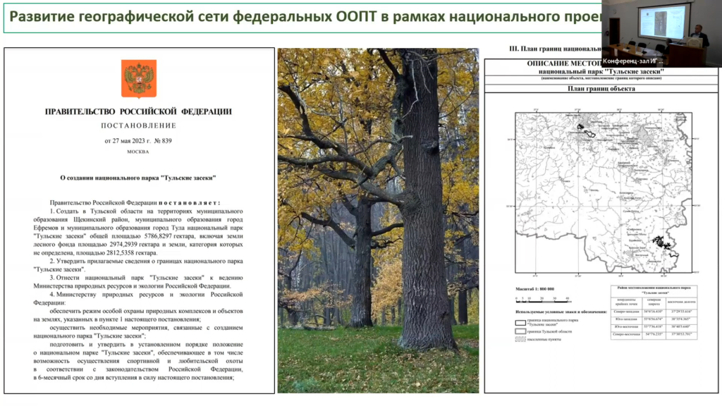 В 2014 году силами специалистов кафедры биоэкологии Тульского государственного педагогического университета было проведено солидное комплексное экологическое обследование соответствующей территории и подготовлены материалы для будущего нацпарка. Они оценивали площадь планируемой территории в 25 тысяч га. По национальному проекту «Экология» утверждение парка площадью 40 тысяч га должно было произойти уже в 2021 году. Наконец, спустя два года, было принято постановление Правительства Российской Федерации от 27.05.2023 № 893 «О создании национального парка «Тульские засеки» для сохранения уникального природно-исторического комплекса лесного массива» площадью… всего около 6000 га, причем далеко не самых ценных. Это десятая часть уникальных засечных лесов, да еще с предусмотренной правительством перспективой «возможности осуществления спортивной и любительской охоты». Территория упразднённого государственного заповедника в границы нового парка не вошла.