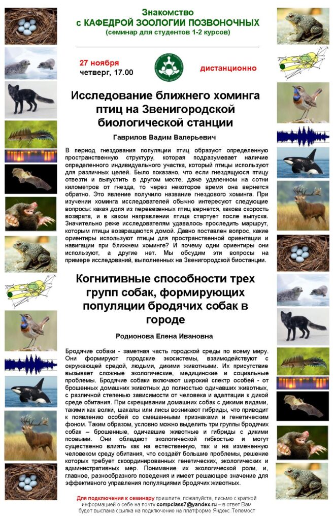 Подробная информация о семинаре, и анонсы предыдущих семинаров доступны на сайте кафедры: http://vertebrata.bio.msu.ru/education/znakomstvo/