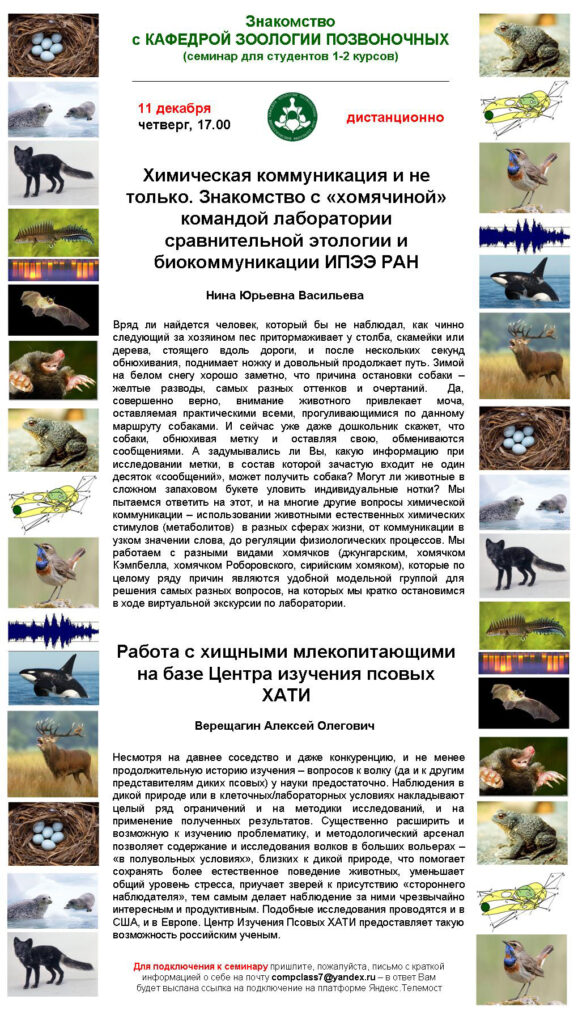 Заключительный в этом году семинар «Знакомство с кафедрой зоологии позвоночных» пройдёт в четверг, 11 декабря, в 17:00 в дистанционном формате в Яндекс.Телемост. Перед Вами выступят сотрудники Института проблем экологии и эволюции РАН и Центра изучения псовых ХАТИ с рассказами о своей научной деятельности.